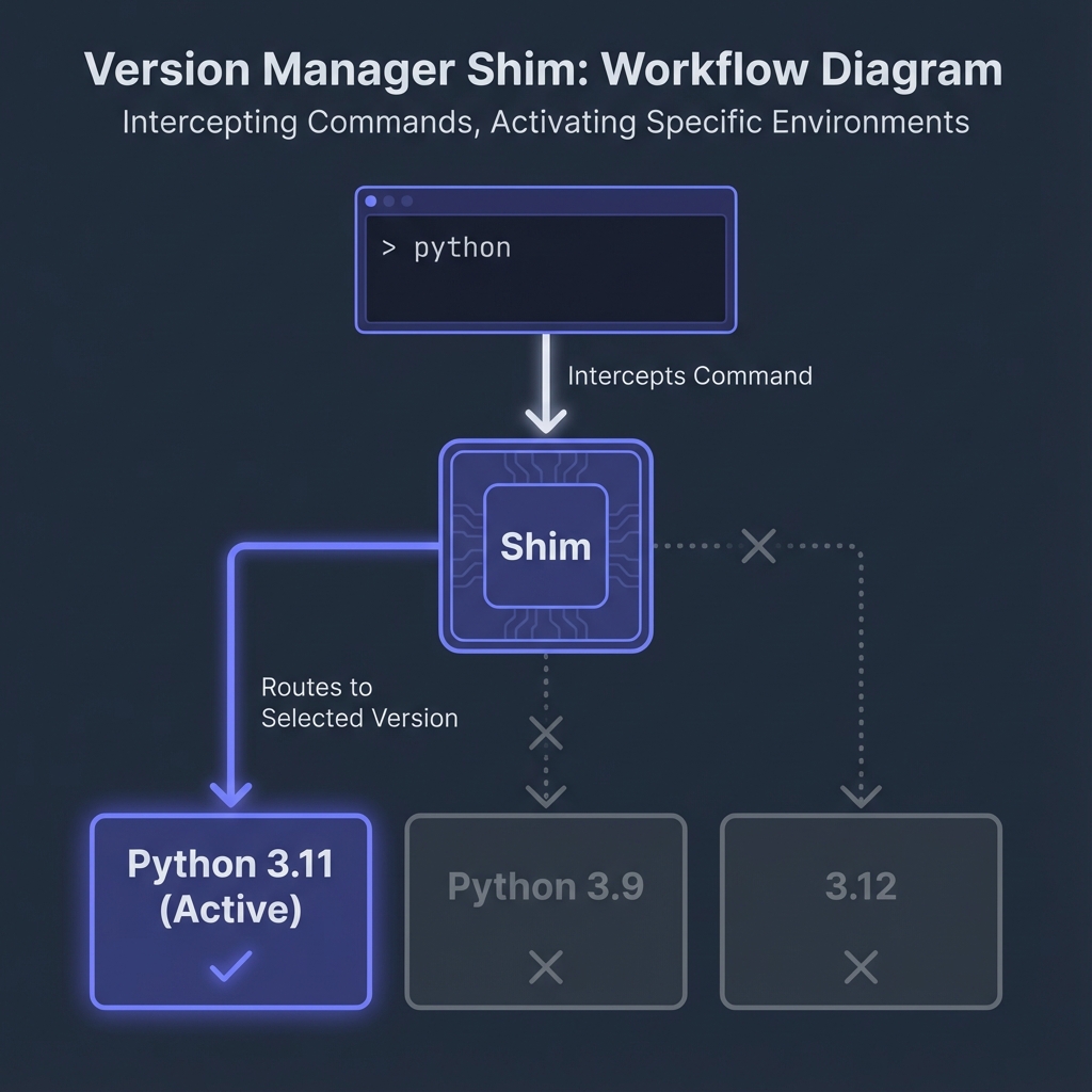 Version managers intercept language commands via shell integration: